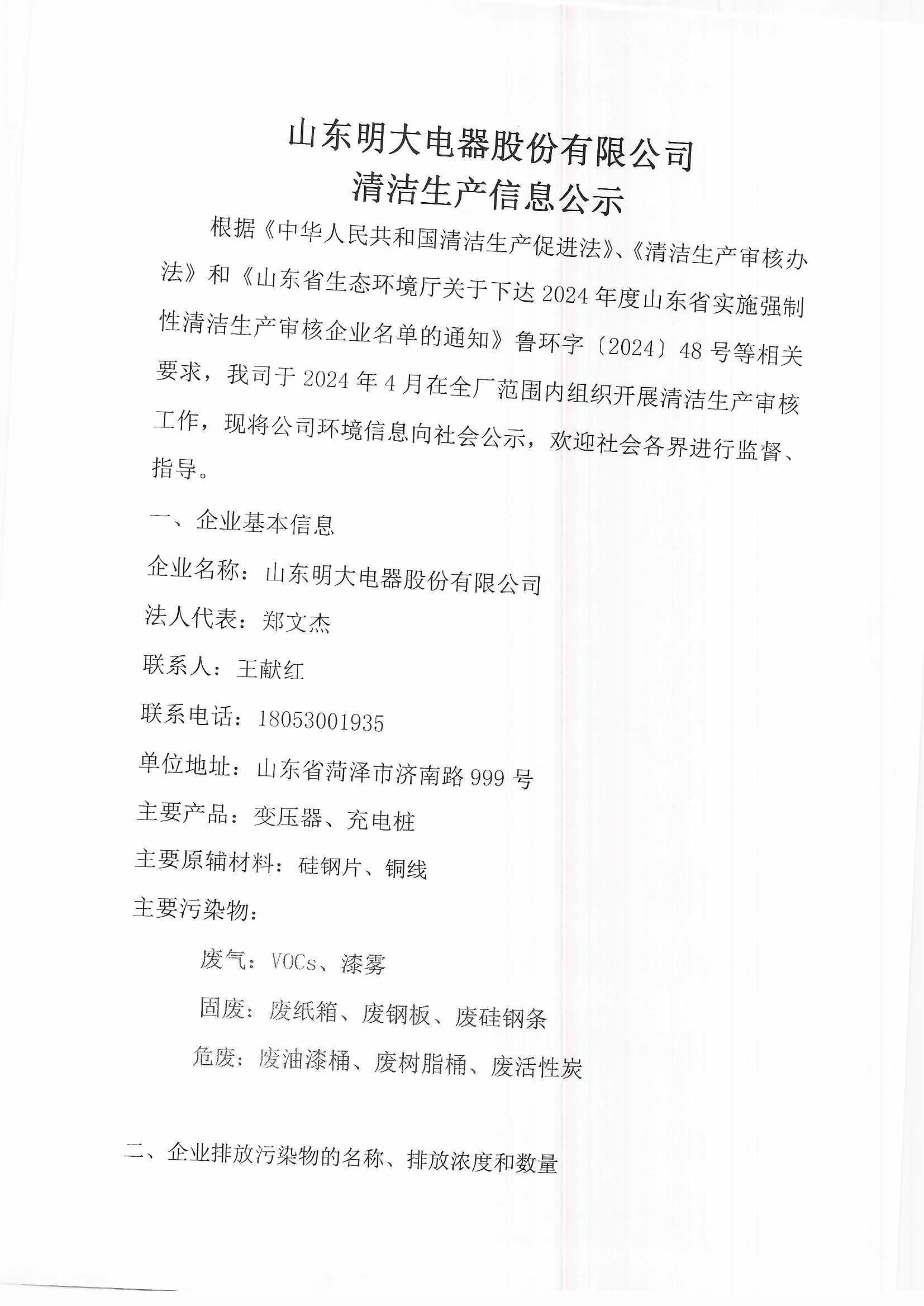 明大电器清洁生产信息公示
